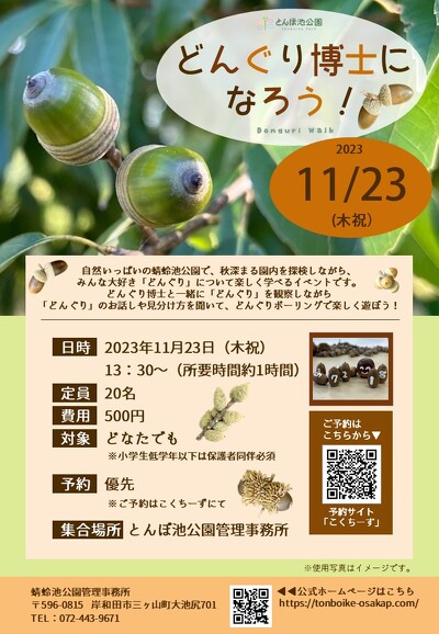 どんぐり博士になろう! 2023年11月23日(大阪府): 園内を探検して、どんぐりを楽しく遊びながら学ぼう! - こくちーずプロを使えば、驚くほど簡単で安全なイベントの告知・集客ができます。...