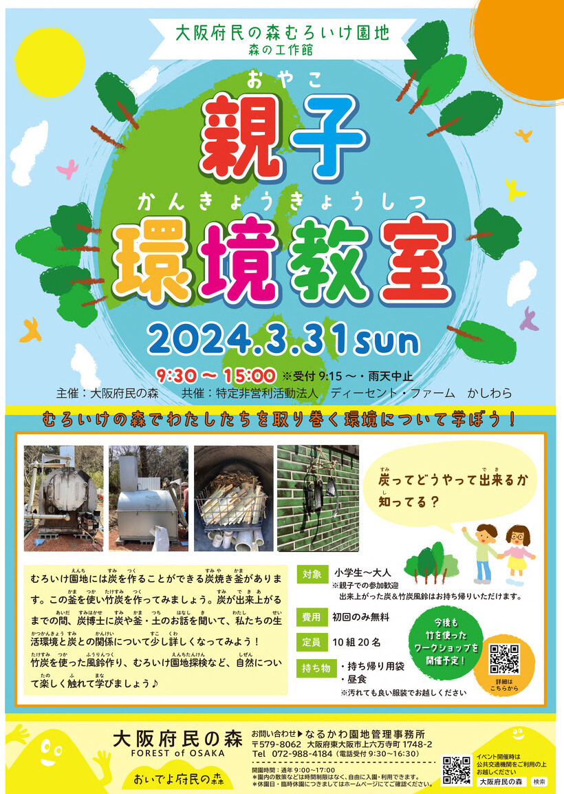 竹炭づくりを通じて、私たちの生活環境と炭との関係について学びましょう! 【環境教室 内容】 ・炭窯で竹炭づくり ・炭博士の炭・窯・土などのお話 ・むろいけ園地散策 ・作った竹炭を使っ...