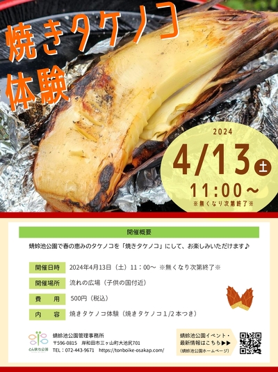 蜻蛉池公園で春の恵みのタケノコを「焼きタケノコ」にして、お楽しみいただけます♪