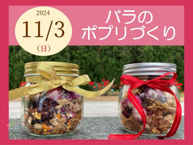 バラのポプリづくり 2024年11月3日(大阪府): 「ポプリ」は香りを楽しむアロマグッズ。 バラにシナモン等のスパイスを加えて、自然のフレグランス「ポプリ」をオリジナルで作りましょう。 -...