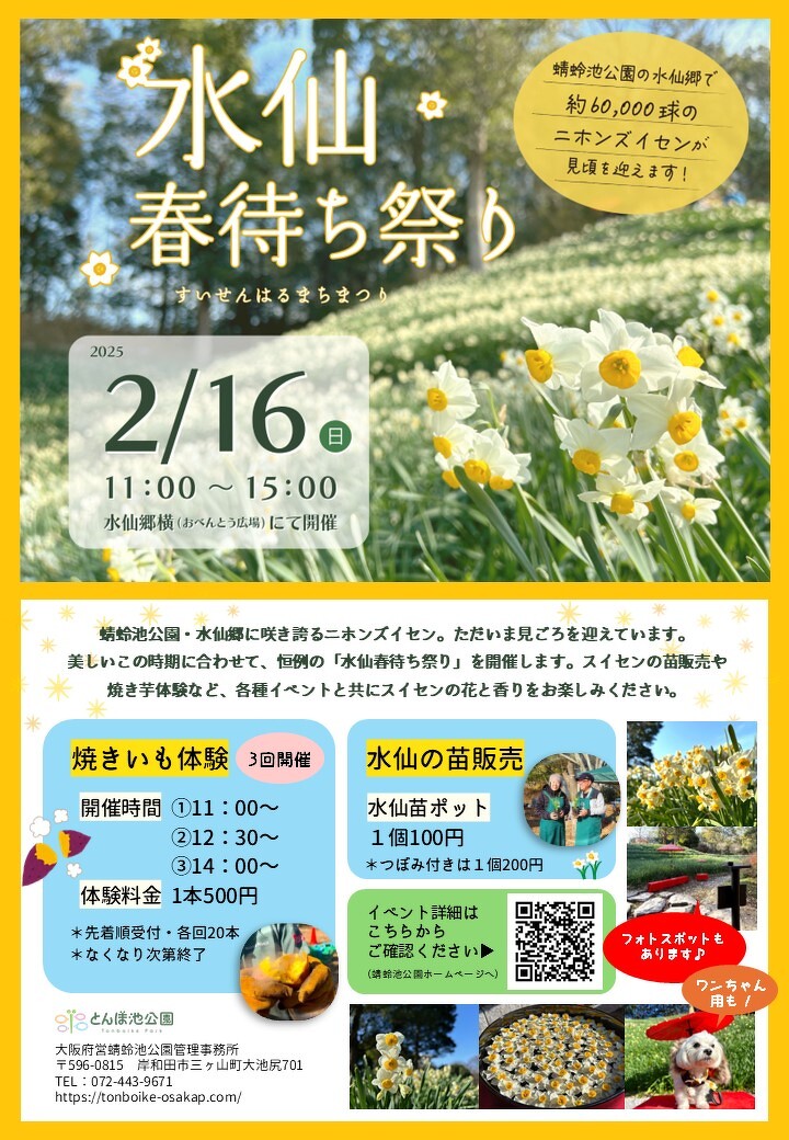 すいせんの苗販売や焼き芋体験など、各種イベントと共にスイセンの花と香りをお楽しみください。