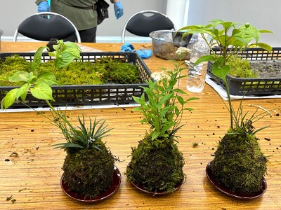 ケト土をこねて、丸めて、苔をつけて、可愛い「こけ玉」を作りましょう。