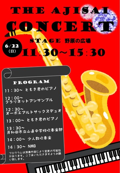 あじさい園前の大きな芝生広場【野原の広場】では、ジャズコンサートを開催予定です。※コンサートは6/22(日)のみ開催