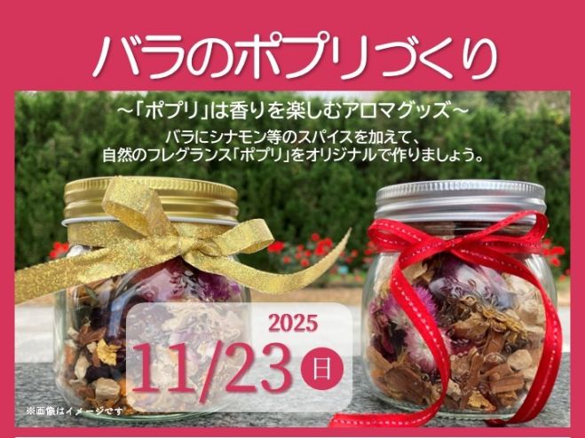 バラのポプリづくり 2025年11月23日(大阪府): 「ポプリ」は香りを楽しむアロマグッズ バラにシナモン等のスパイスを加えて、自然のフレグランス「ポプリ」をオリジナルで作りましょう。 - ...