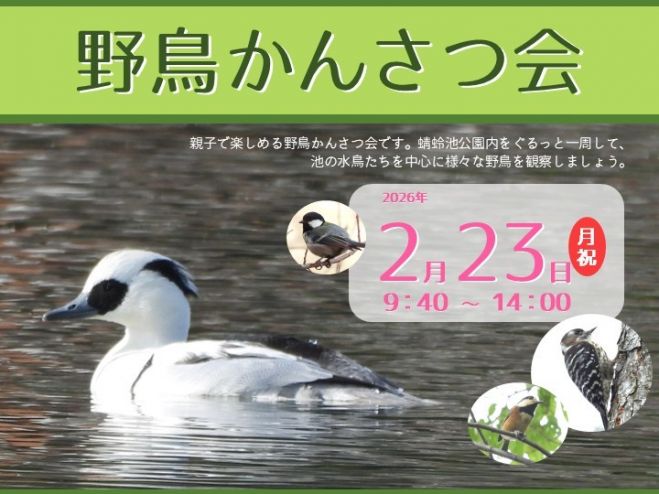 野鳥かんさつ会 2026年2月23日(大阪府): 親子で楽しめる野鳥かんさつ会です。 蜻蛉池公園内をぐるっと一周して、池の水鳥たちを中心に様々な野鳥を観察しましょう。 - こくちーずプロを使...