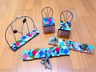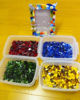 ステンドグラスの色ガラスを細かくした端材やタイルなどをフォトフレームなどの素材の廻りに木工ボンドを使って貼って仕上げます。