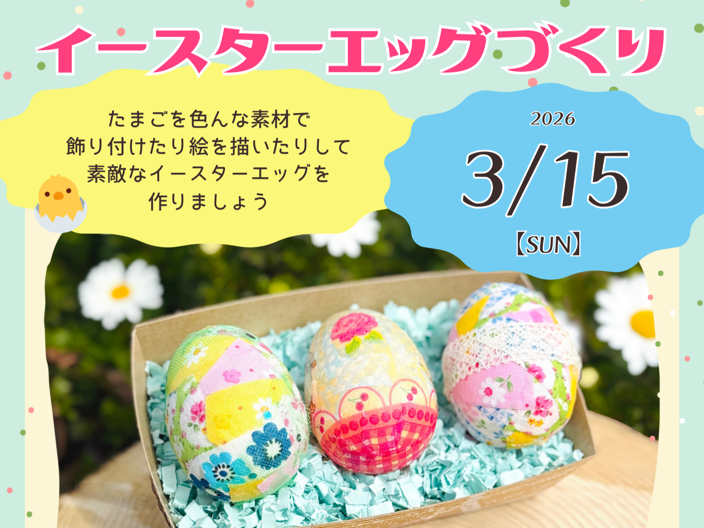 イースターエッグづくり 2026年3月15日(大阪府): たまごを色んな素材で飾り付けたり絵を描いたりして、 素敵なイースターエッグを作りましょう。 - こくちーずプロを使えば、驚くほど簡単...