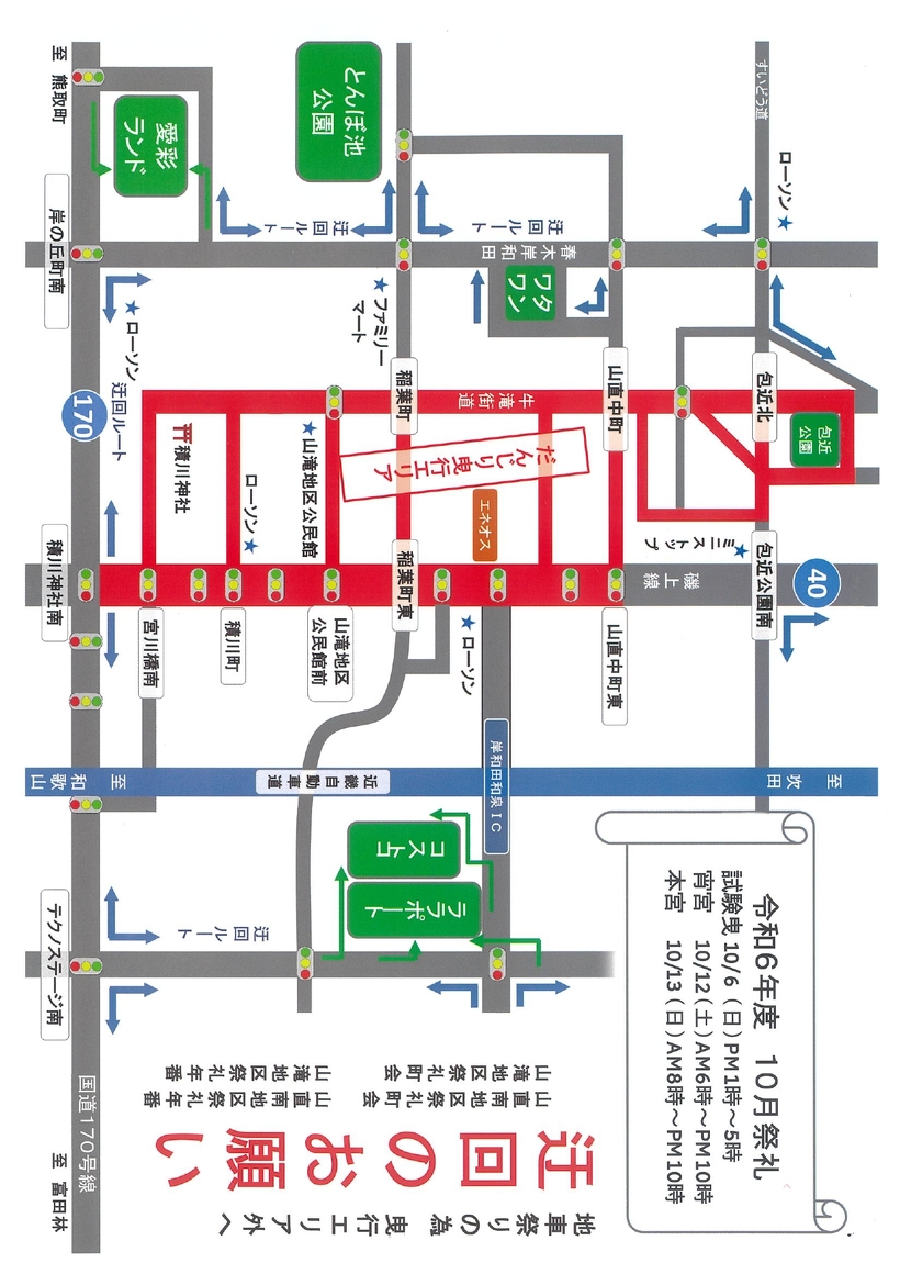 該当日時に周辺道路をご利用の場合は、曳行エリア外へ迂回をお願いいたします。