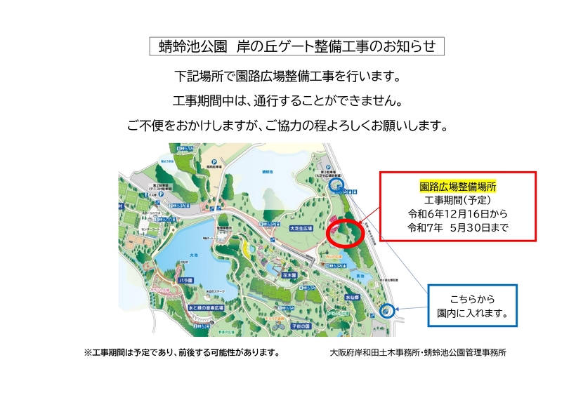 蜻蛉池公園 岸の丘ゲート整備工事のお知らせ