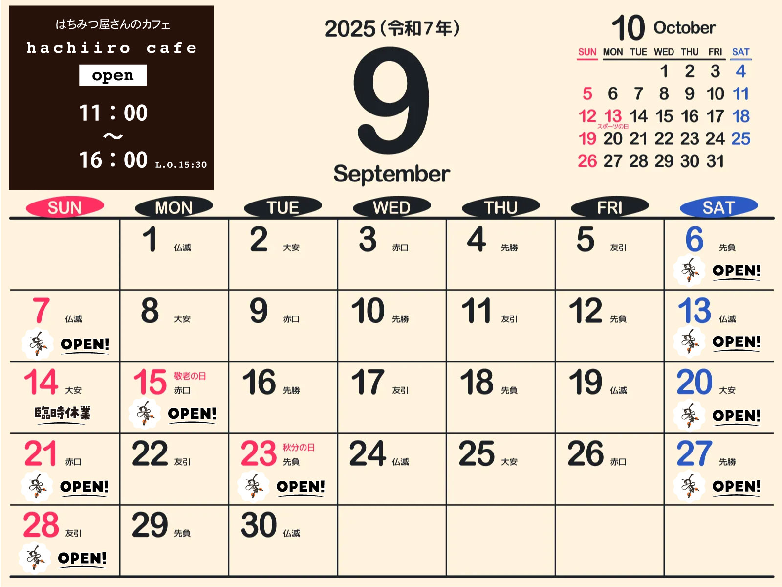 ※カレンダーに蜂マークが付いている日が営業日です。