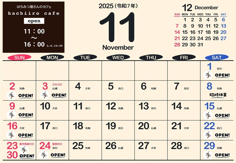 ※カレンダーに蜂マークが付いている日が営業日です。