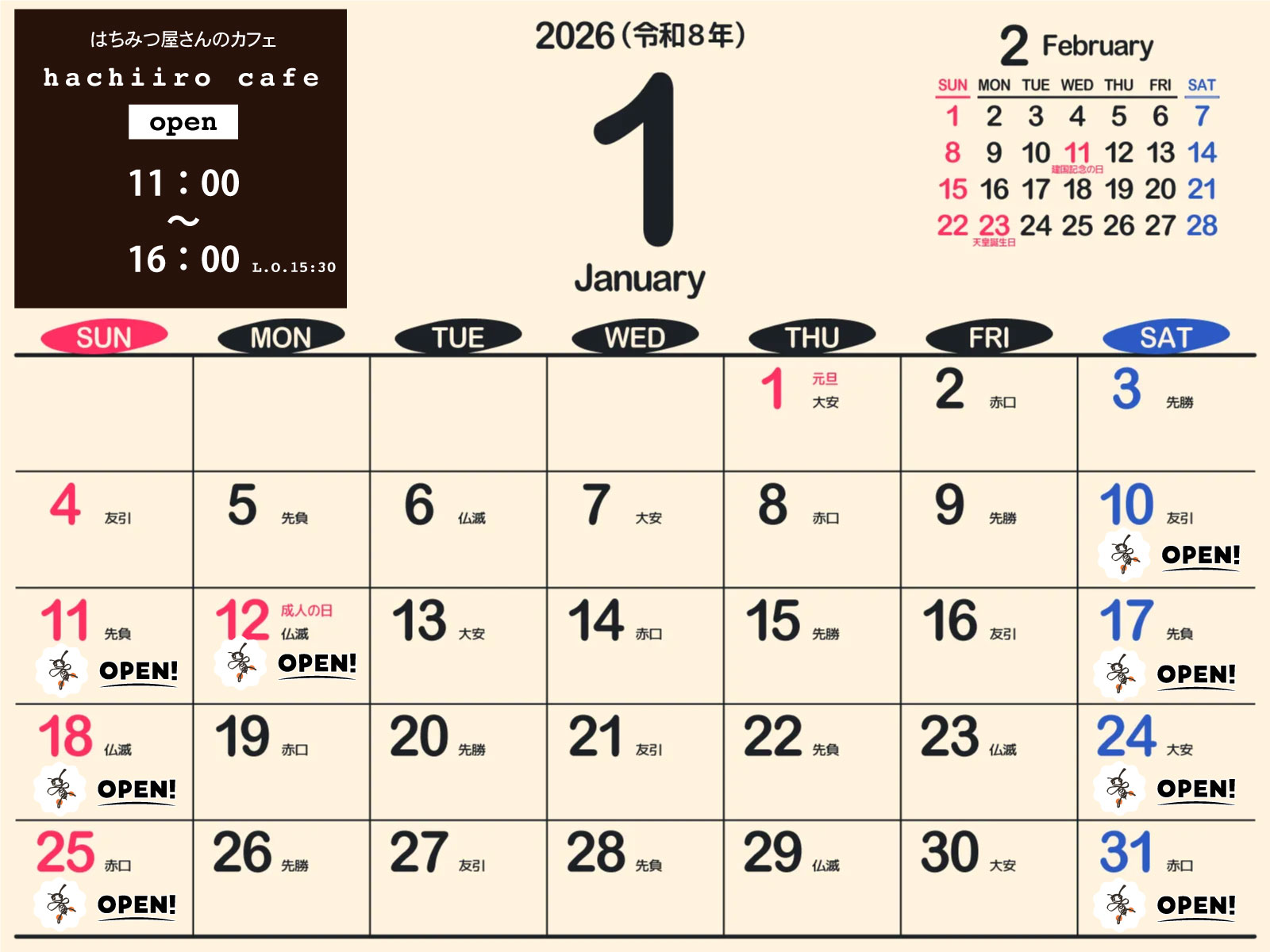 ※カレンダーに蜂マークが付いている日が営業日です。