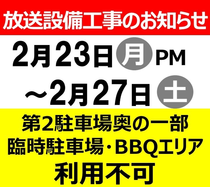 2026年2月23日(月祝)PM~2月27日(金)の間、放送設備工事を実施いたします。