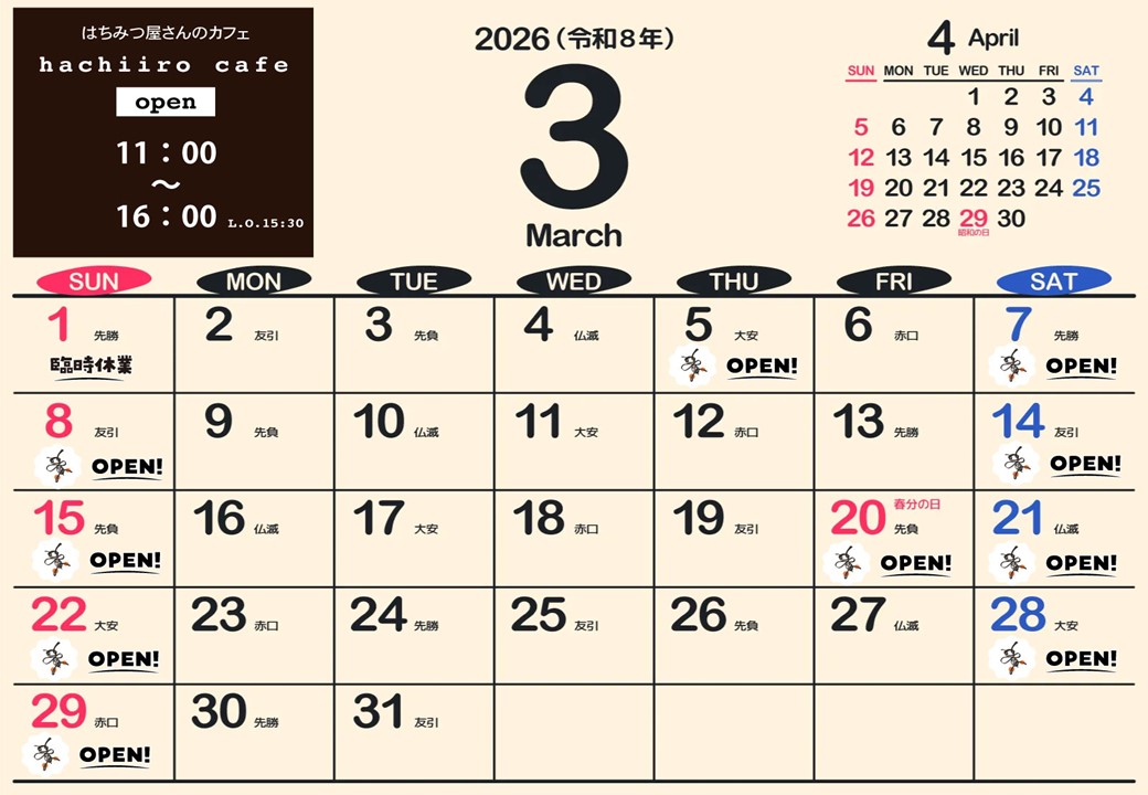 ※カレンダーに蜂マークが付いている日が営業日です。