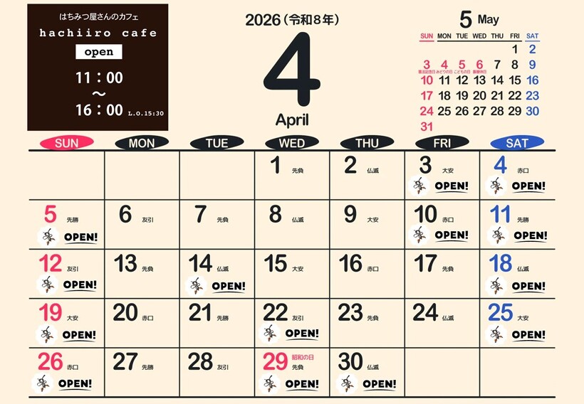 ※カレンダーに蜂マークが付いている日が営業日です。