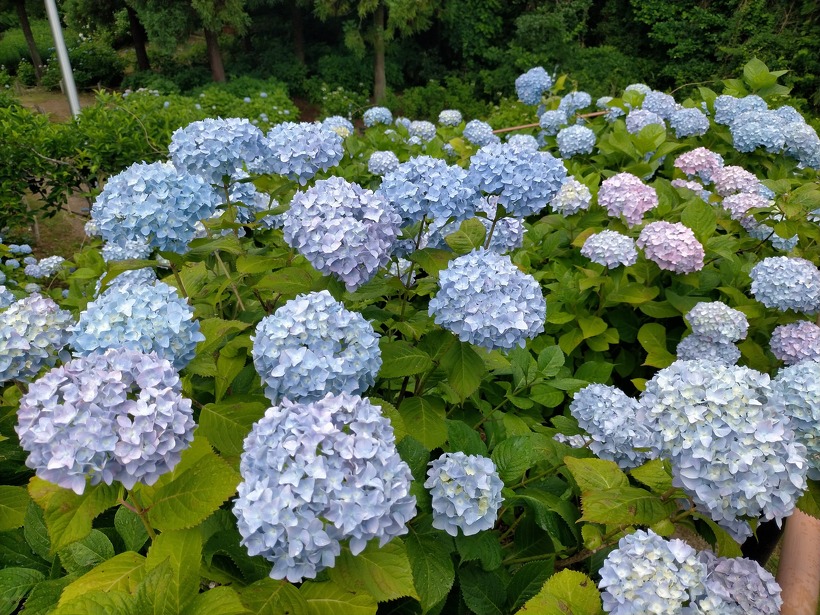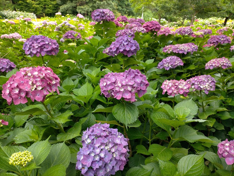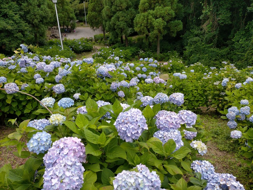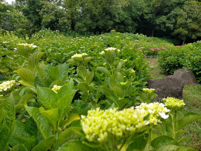 あじさい園奥付近、中央付近、入り口付近の順に開花状況をご覧下さい。