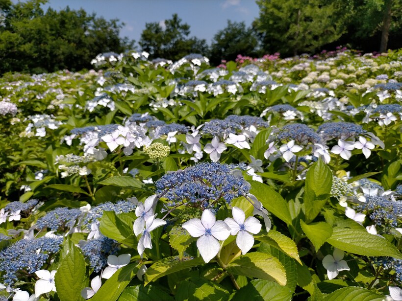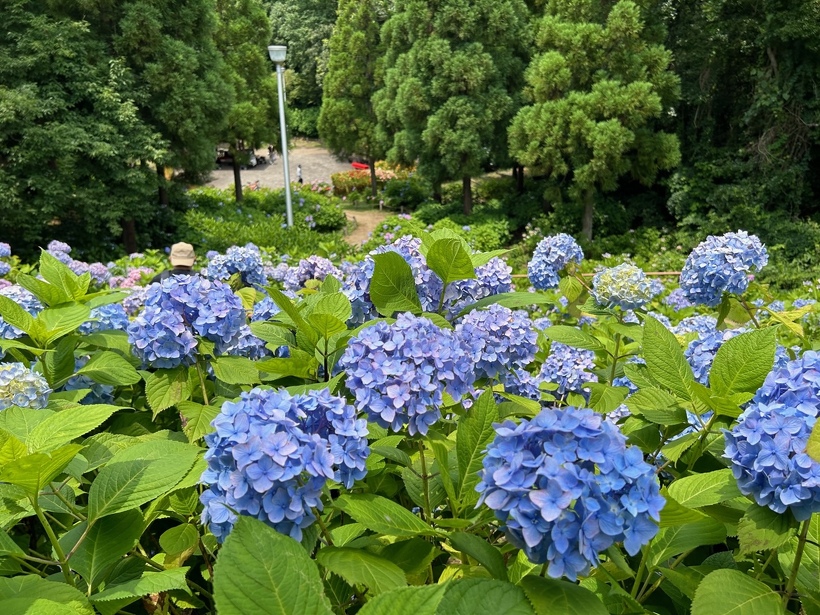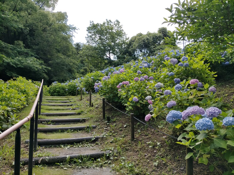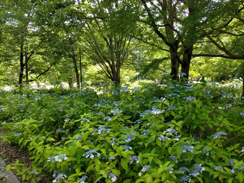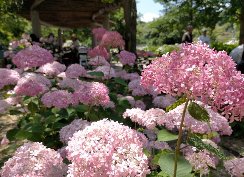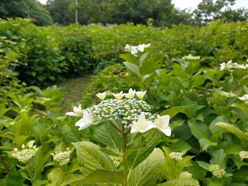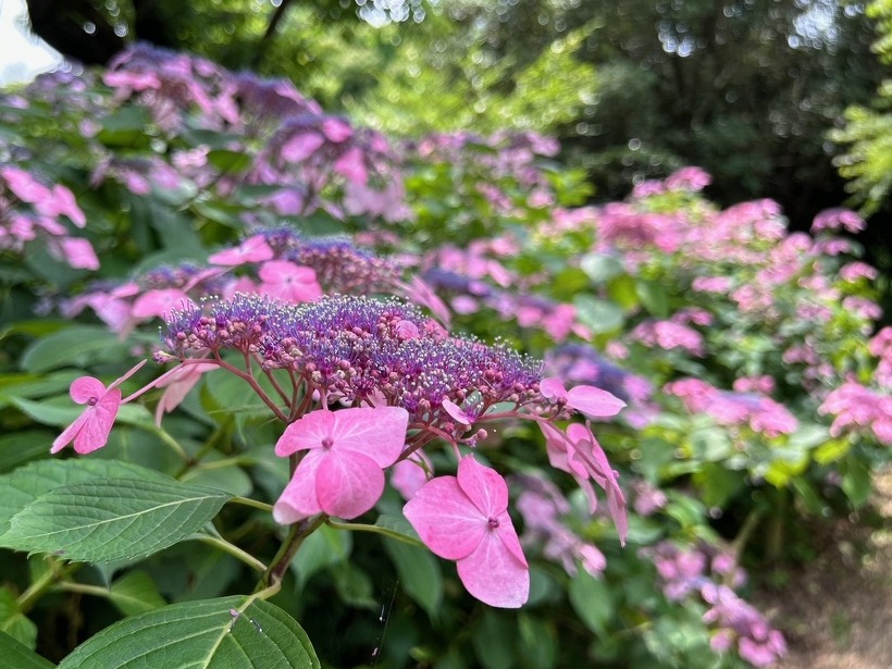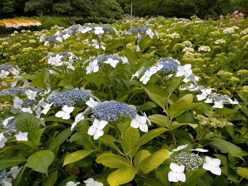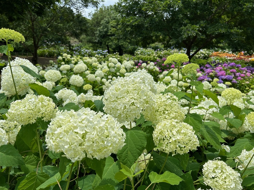 あじさい園入り口のアジサイはまだ蕾が多いですが、少し色づいたものも出てきました。入り口から少し進むとカシワバアジサイやガクアジサイ、ヤマアジサイなどがそれぞれ綺麗に咲いています。あじさい園の一番奥、階段のある斜面のセイヨウアジサイは現在満開、見頃を迎えています。