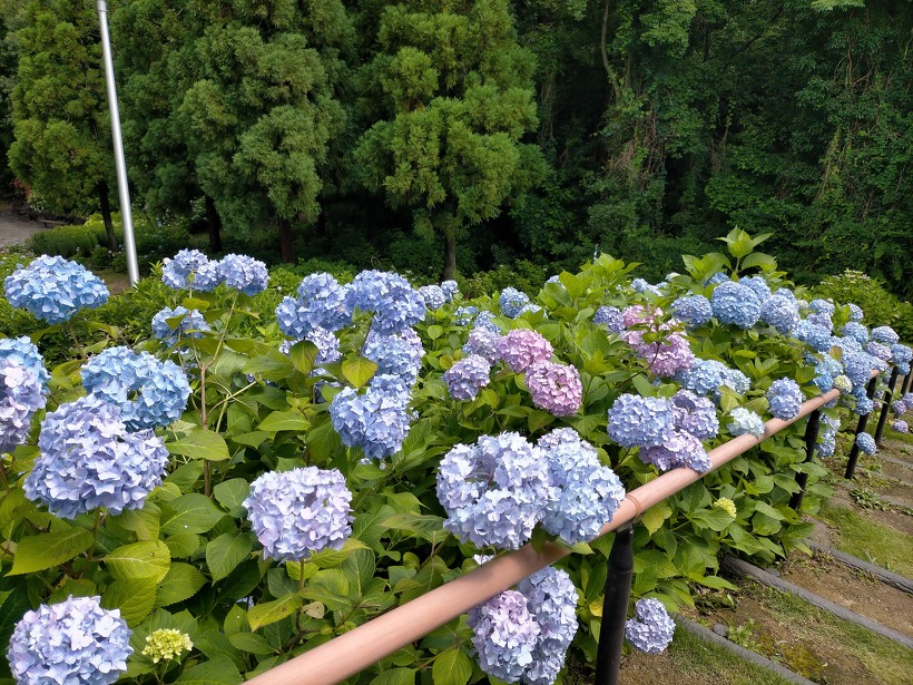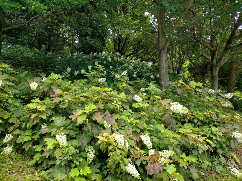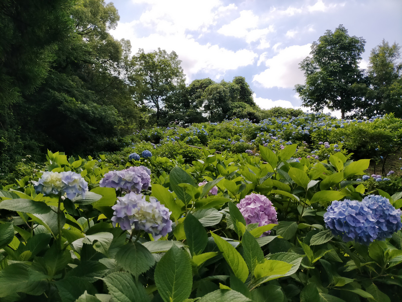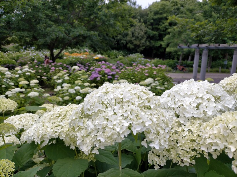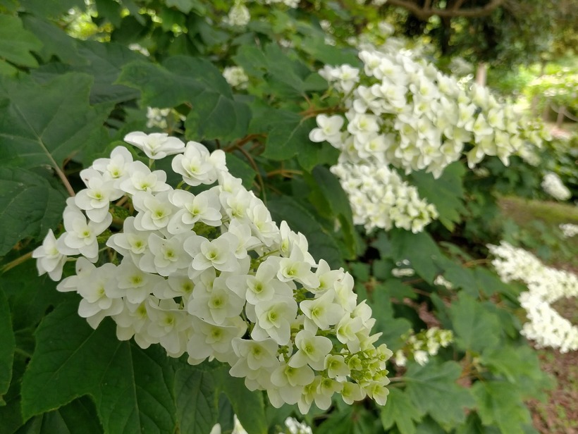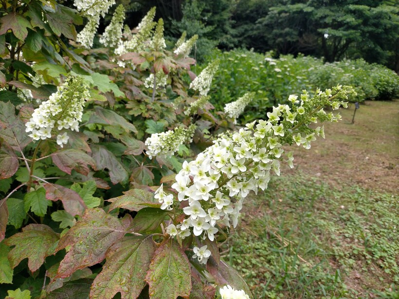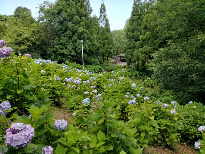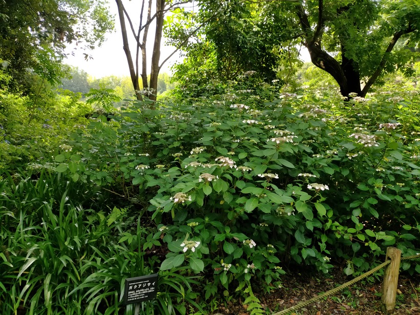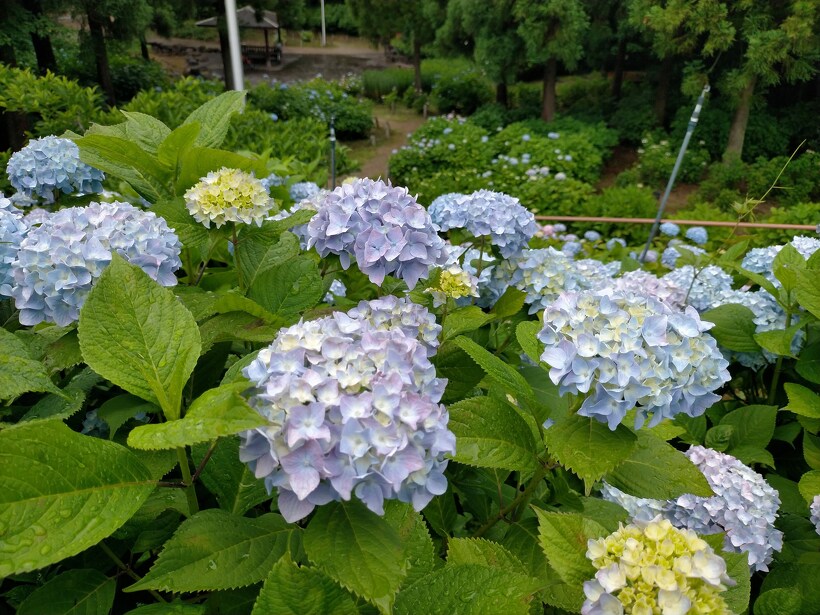 あじさい園入り口のアジサイはまだ蕾が多いですが、少し色づいたものも出てきました。入り口から少し進むとカシワバアジサイやガクアジサイ、ヤマアジサイなどがそれぞれ綺麗に咲いています。あじさい園の一番奥、階段のある斜面のセイヨウアジサイは現在満開、見頃を迎えています。
