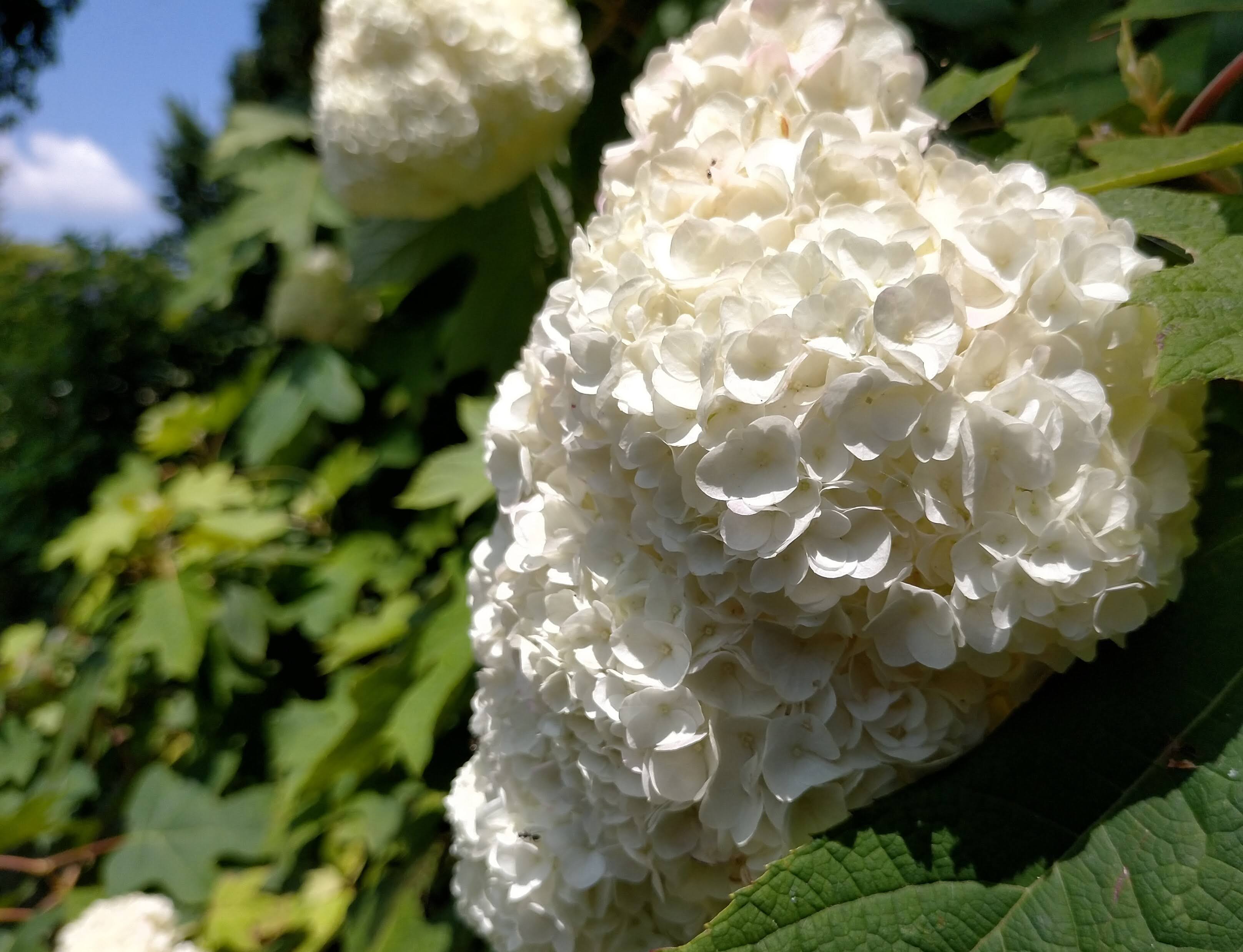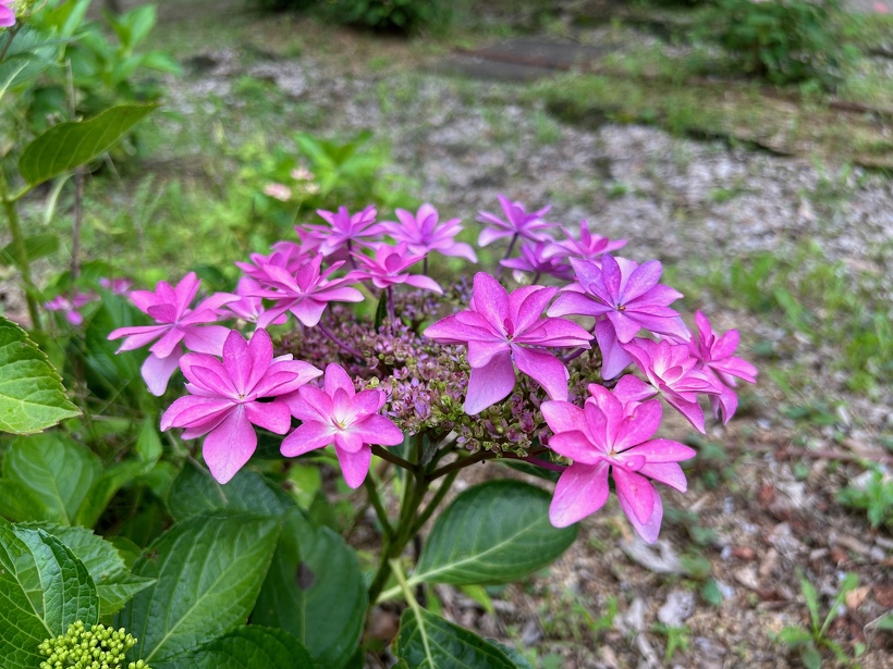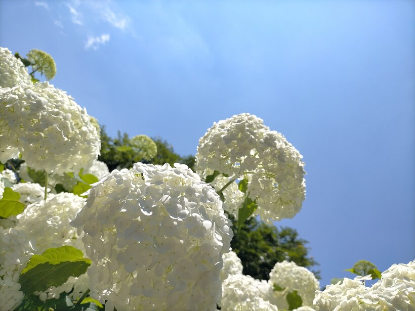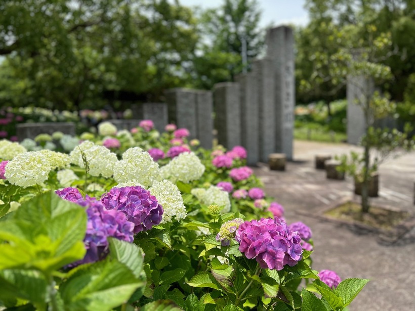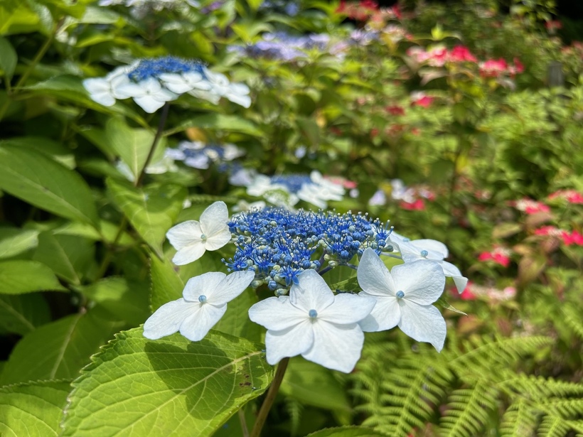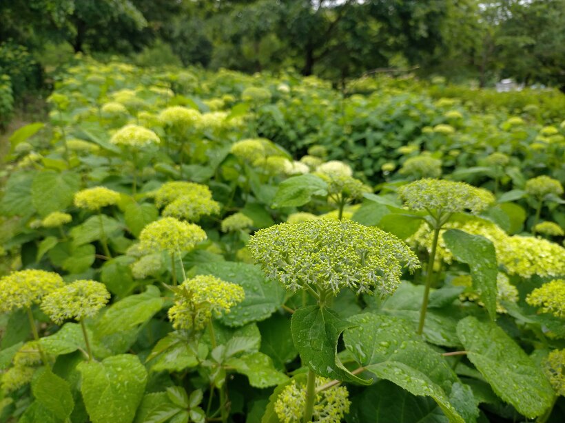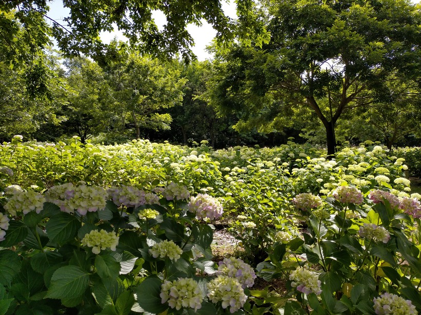 あじさい園入り口のアジサイはまだ蕾が多いですが、少し色づいたものも出てきました。入り口から少し進むとカシワバアジサイやガクアジサイ、ヤマアジサイなどがそれぞれ綺麗に咲いています。あじさい園の一番奥、階段のある斜面のセイヨウアジサイは現在満開、見頃を迎えています。
