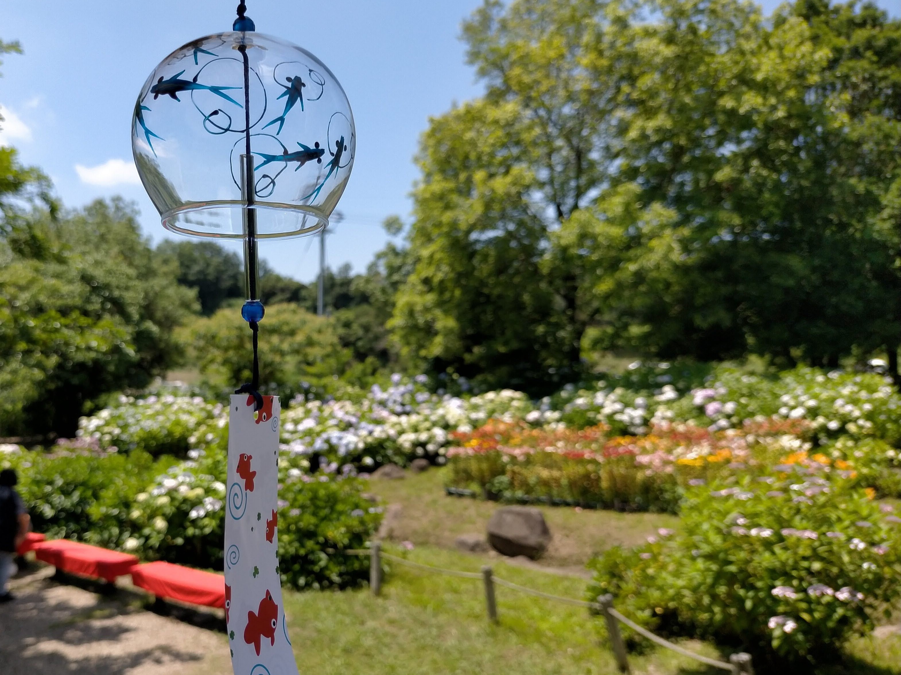 6月17日~18日には「あじさいフェア」を迎える本日のあじさい園は、綺麗な青空と園全体に広がる花々で大賑わいです。表紙の写真は「アナベル」蕾の頃は淡い緑、花が咲くと純白、咲き進んでいくと再び緑に変化し、秋にはドライフラワーのように乾燥した茶色になります。2枚目の写真は本日より始まった、涼を楽しむ風鈴かざりです。3枚目は「城ケ崎」東伊豆の城ヶ崎海岸で発見された自生種、4枚目は「ハーモニー」小さな手まり状の花がアイスクリームパフェのように段々に積み重なった花房を形成する品種です。その他写真は順にあじさい園入り口付近、中央付近、奥付近です。ししおどしも素敵な音を奏でています。