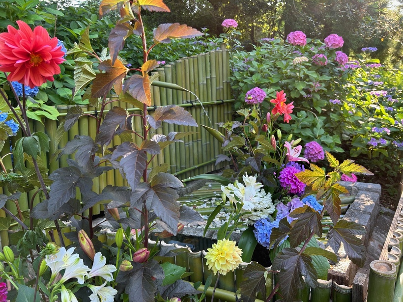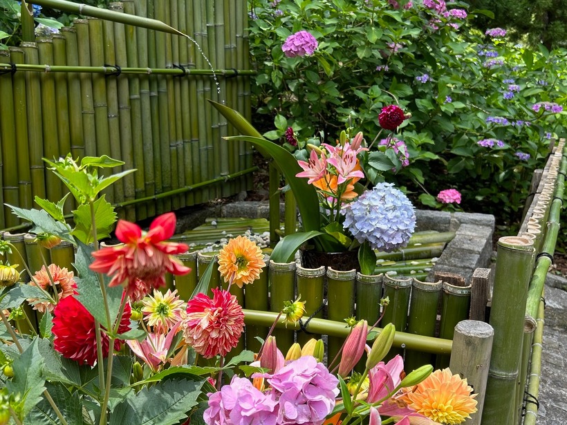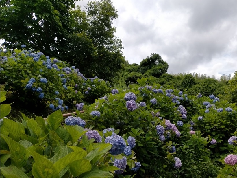 写真は順にあじさい園入り口付近、中央付近、奥付近です。奥付近にある東屋の側にはスタッフ手作りの「ししおどし」も登場していますので、ぜひアジサイを眺めながら、ししおどしの音に耳を傾けてくださいね。
