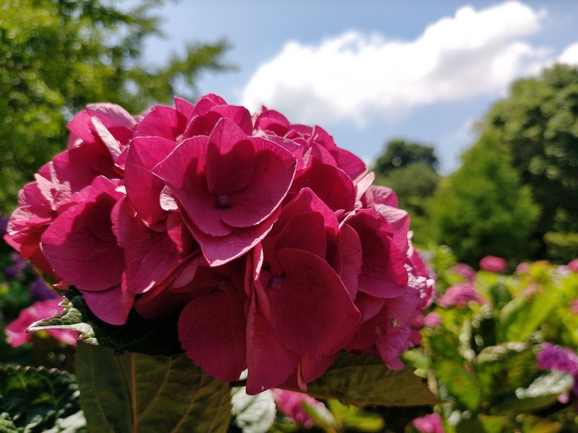 色とりどりのアジサイが広がるあじさい園、入り口付近のアナベル も開花した株が増えて、これから咲く緑~白のグラデーションで爽やかな色合いです。1枚目のアジサイは入り口付近に咲くダンスパーティー。濃いピンク色の装飾花が目を引きます。