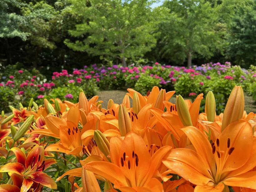 あじさい園ではピンク、赤、白、ブルー、紫に輝く大きな花がところ狭しと咲き、梅雨の季節を晴れやかに彩っています。週末の「あじさいフェア」ではイベントも盛りだくさん、皆様のご来園お待ちしております。表紙の写真は「ピンクアナべル」初夏に咲く優しいピンク色の花です。写真は順にあじさい園入り口付近、中央付近、奥付近です。奥付近にある東屋横にはスタッフ手作りの「ししおどし」も登場、色鮮やかな花々で飾りつけされ写真映え間違いなしです。まだまだユリも見ごろを迎えております。