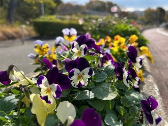 第2・第3駐車場から管理事務所へ向かう道中、交差点のすぐ側にある花壇です。大池沿いの花壇と同じく、パンジーやキンギョソウ等に植え替えました。明るくカラフルで元気が出る色合いです。