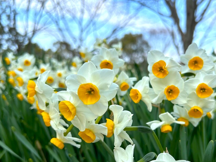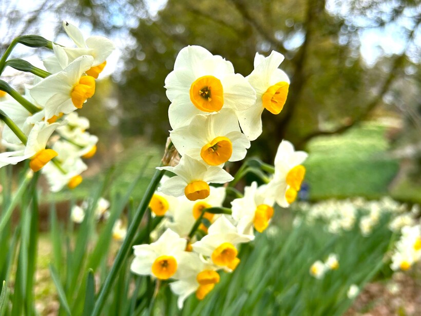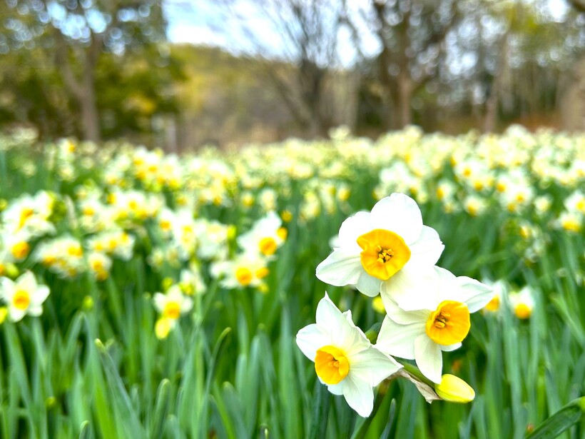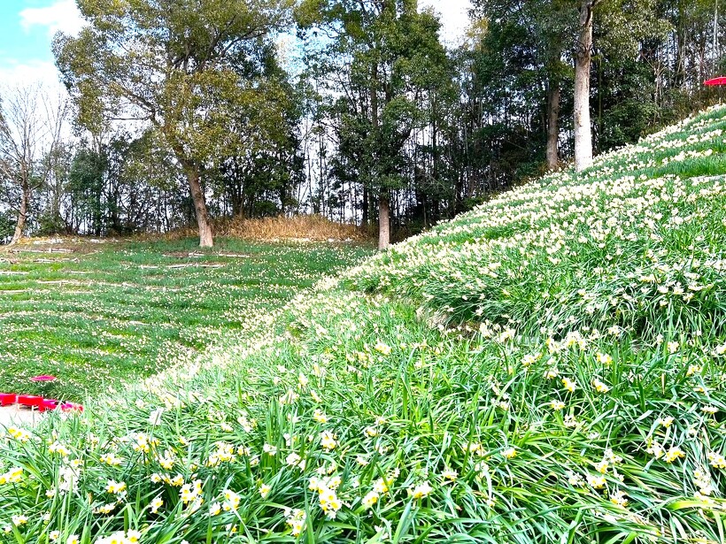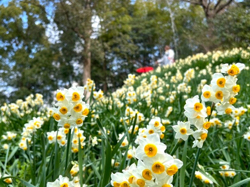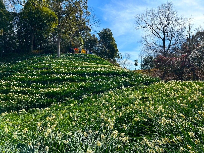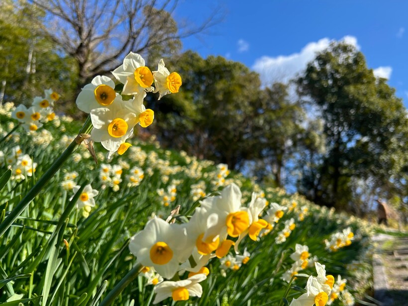 真ん中の大木辺りから咲き始めたスイセンの花は、円を描くように周りへと広がりまだまだ花盛りです。