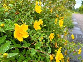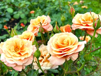 可愛らしいカップ咲きの花が、たわわに咲きほこりバラ園ポケット広場を美しく彩っています。