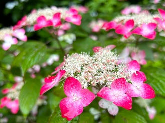 その名の通り紅色に色づくヤマアジサイです。装飾花が、初めは白く、段々と紅色に色付きます。
