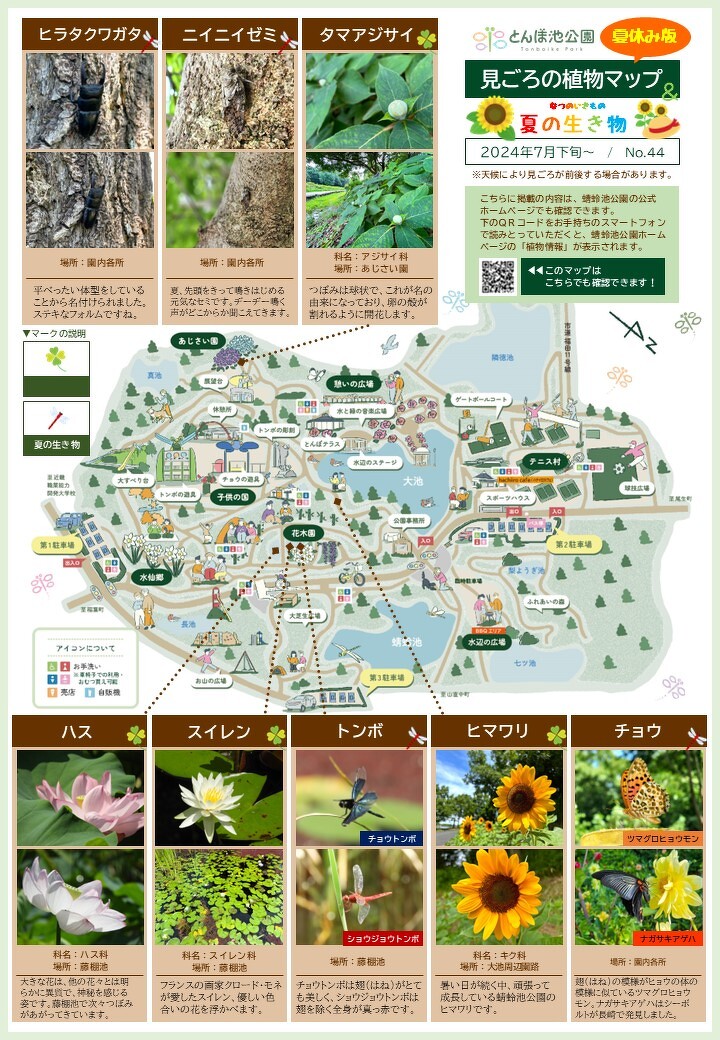 今回からしばらくの間、夏真っ盛りの夏休み版!ということで、園内の「見ごろの植物&夏の生き物」バージョンでお届けします!この暑さの中でもご覧いただける植物と、蜻蛉池公園の自然の中で暮らす生き物たちをご紹介します。