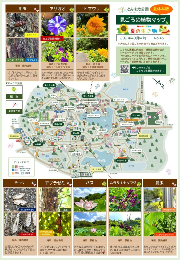 しばらくの間、夏真っ盛りの夏休み版!ということで、園内の「見ごろの植物&夏の生き物」バージョンでお届けします!この暑さの中でもご覧いただける植物と、蜻蛉池公園の自然の中で暮らす生き物たちをご紹介します。