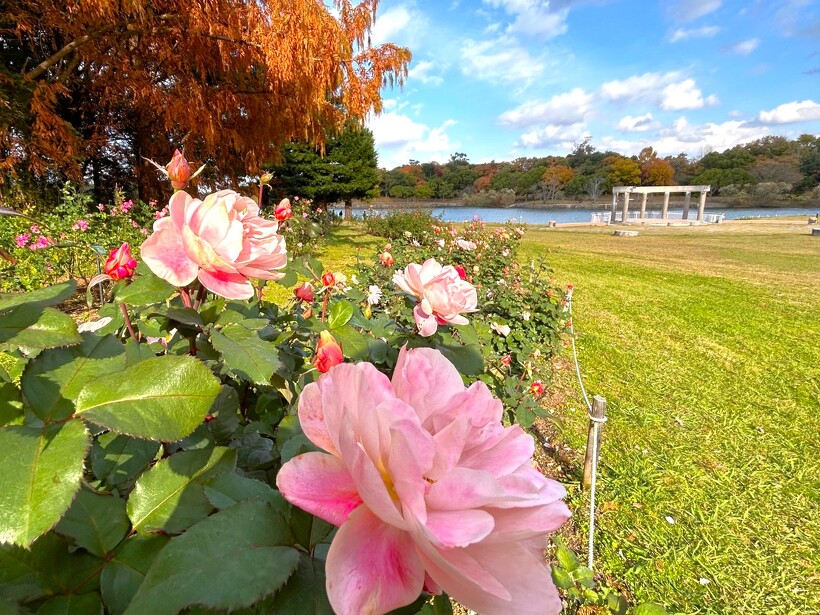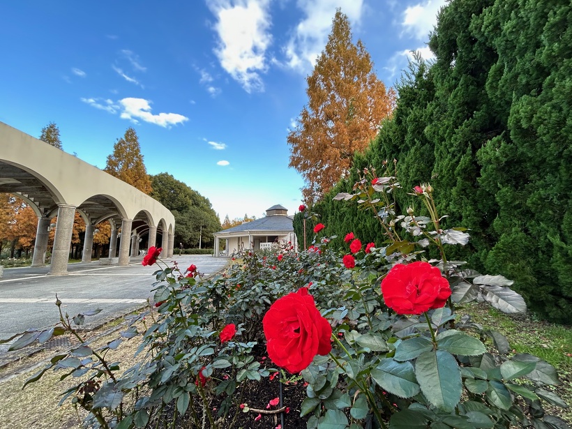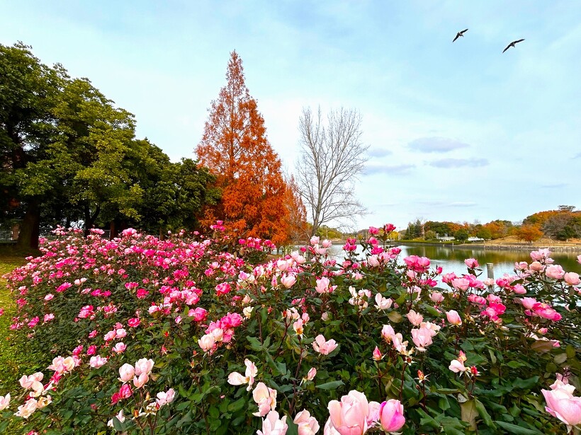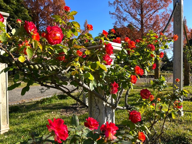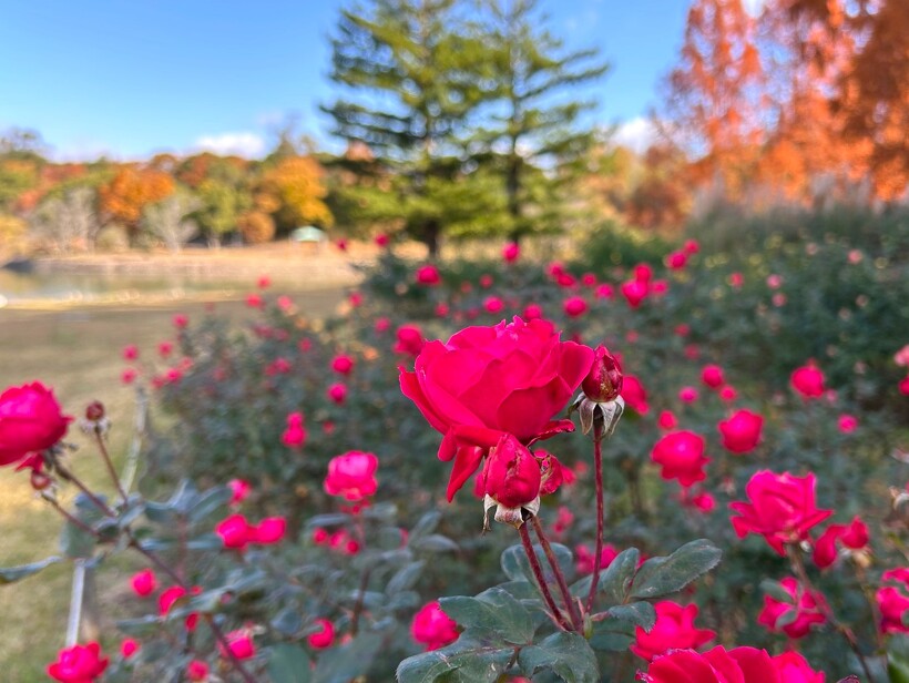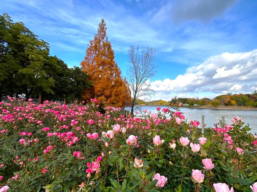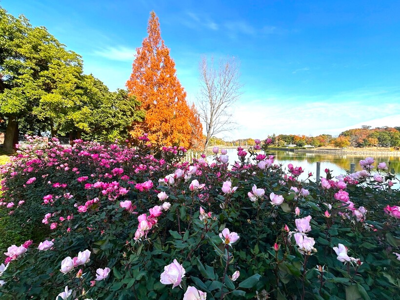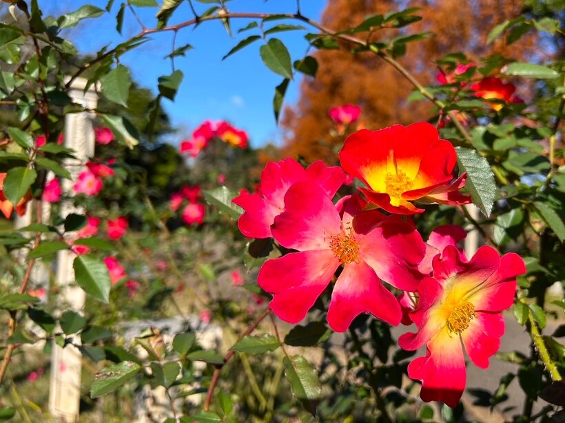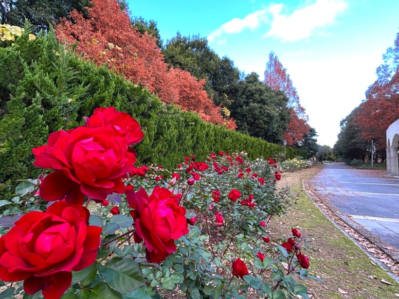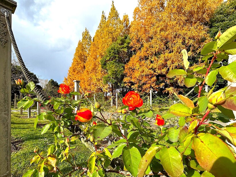 咲き誇る色とりどりのバラ、真っ赤に色づいた紅葉がステキなメタセコイヤ、