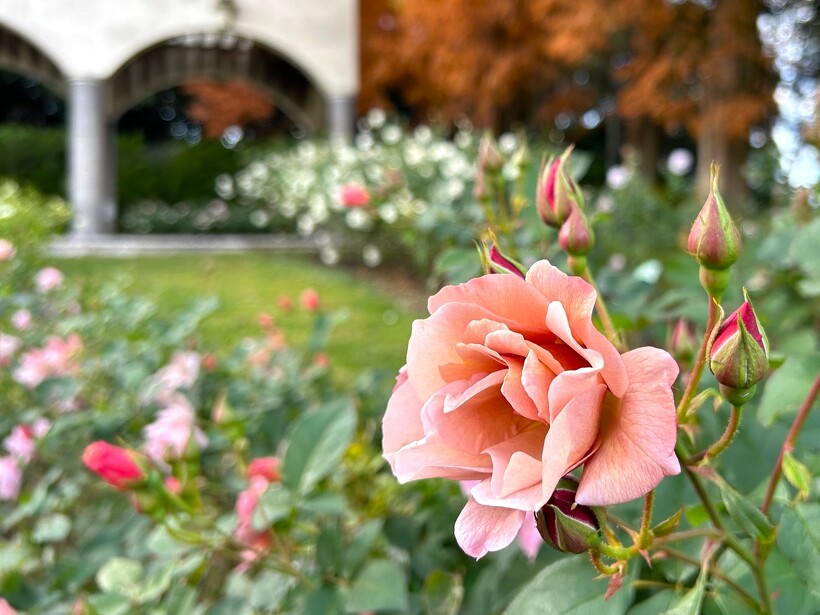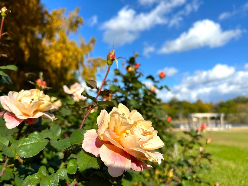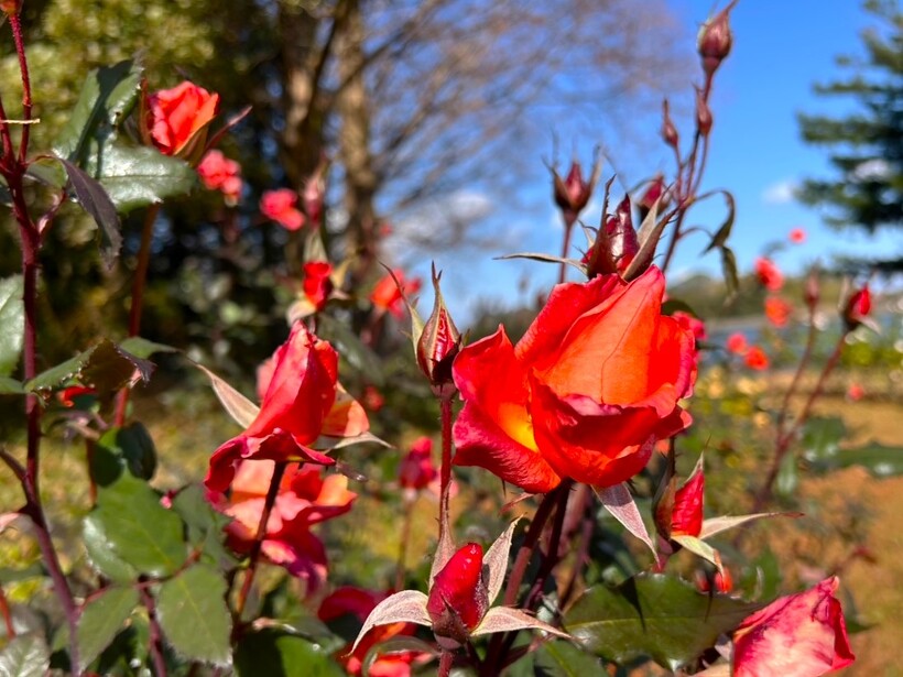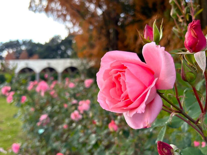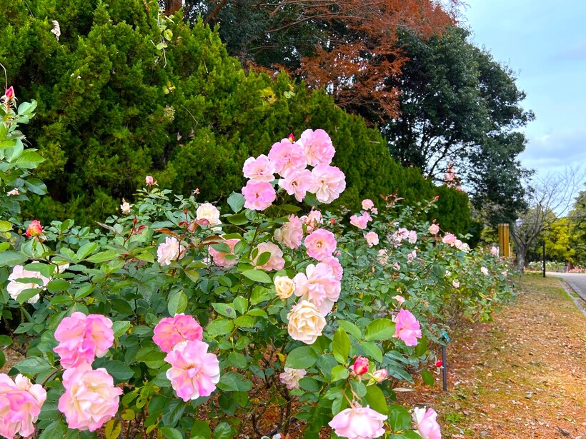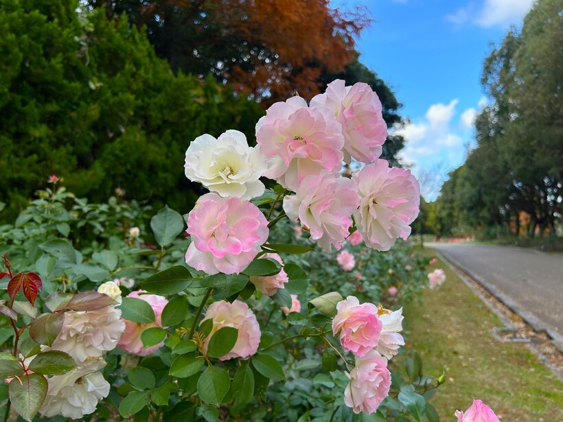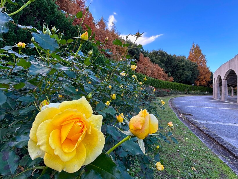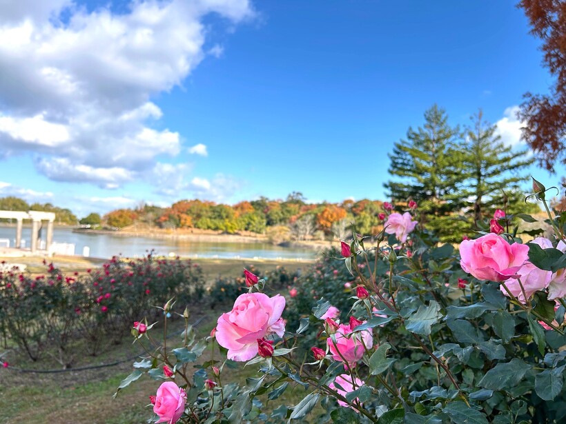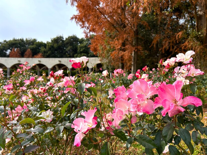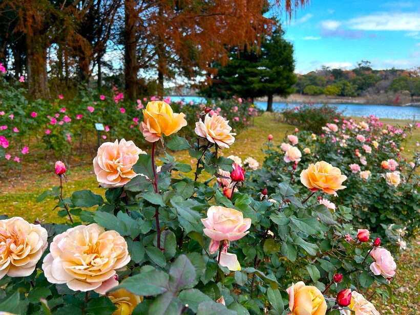 咲き誇る色とりどりのバラ、真っ赤に色づいた紅葉がステキなメタセコイヤ、
