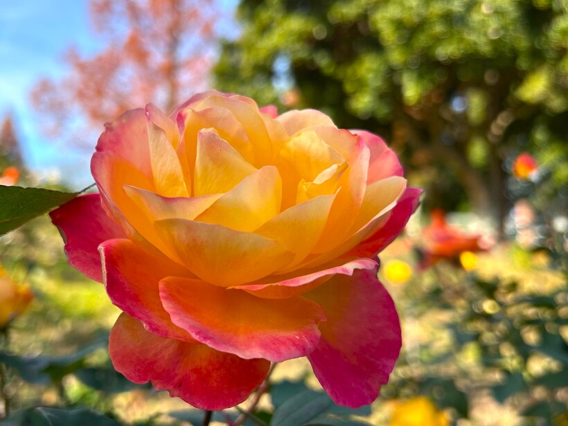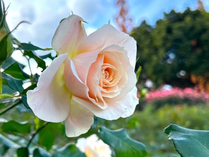 高く澄んだ青空に、一面の色とりどりの美しいバラをご覧いただけます。