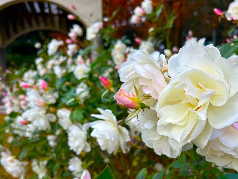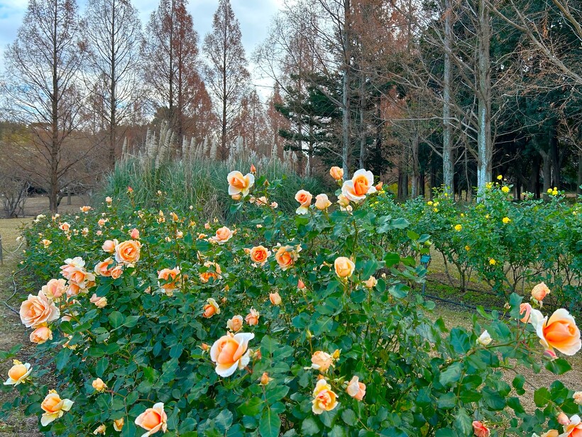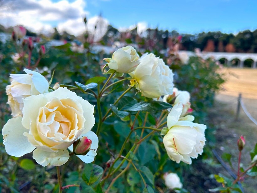 ゴールドバニー、プリンセスミチコ、アンティークレース、和音、等、綺麗な冬のバラ園をぜひお楽しみください。