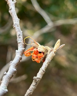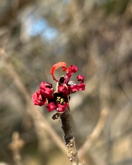 落葉後、早春に開花します。現在、綻んだつぼみからほんの少し黄色や赤の細い花弁をのぞかせています。