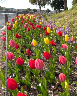 昨年12月に植え付けたチューリップが大池沿いで元気に開花しています。