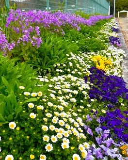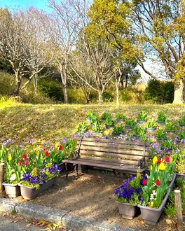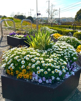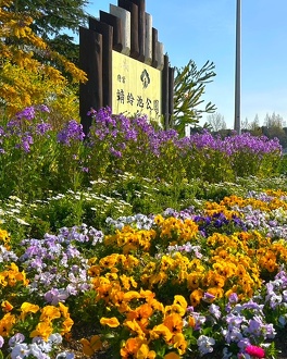 管理事務所やスポーツハウス周りの花壇には、明るくカラフルで元気が出る色合いのビオラやノースポール、ムラサキハナナやムギ等が大きく育ちご来園される皆様をお待ちしています。