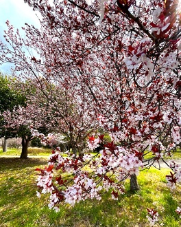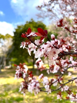 その名前「紅(ベニ)葉(バ)スモモ」の通り、花とともに小さな赤みがかった葉が現れ、木を全体的に赤っぽく感じさせます。本格的な春の訪れを感じさせてくれる美しい花です。