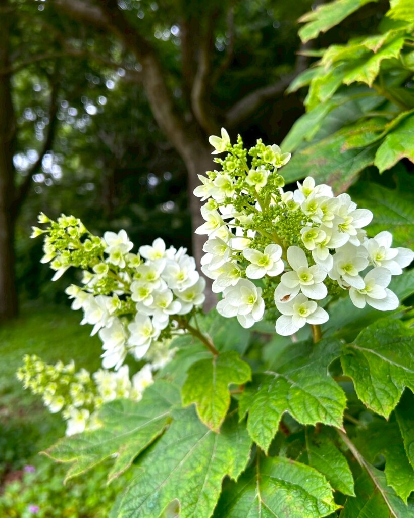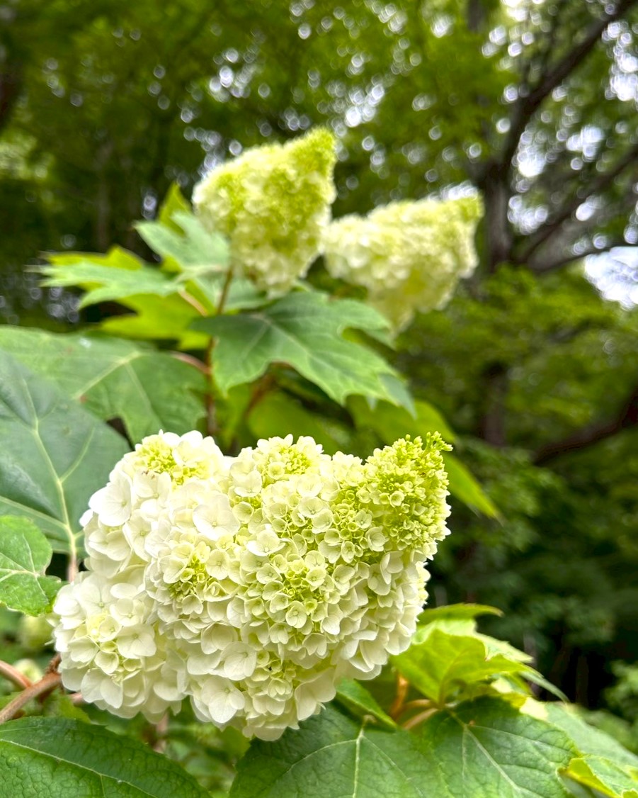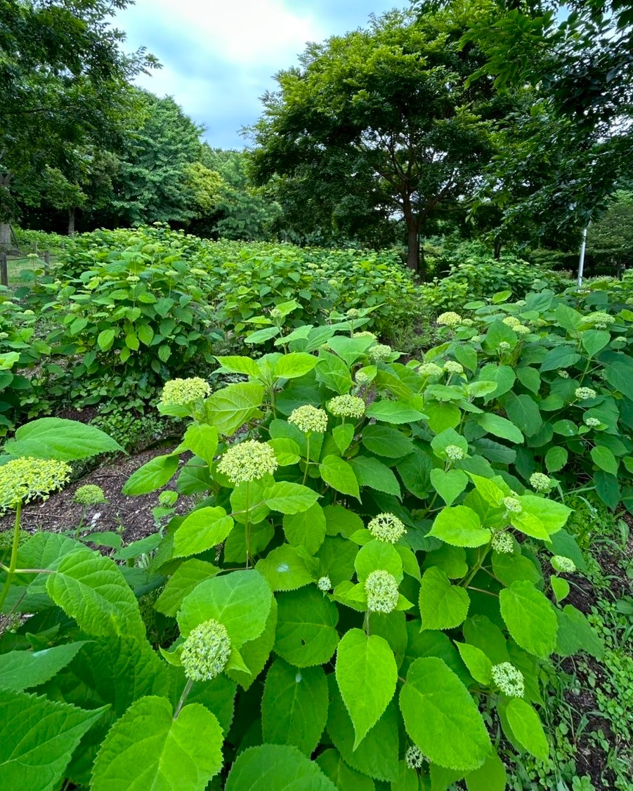 少し控えめに可憐な姿を持つ様々な「ヤマアジサイ」が満開を迎え、ひときわ目を引く「セイヨウアジサイ」「ガクアジサイ」「カシワバアジサイ」「アナベル」などは、蕾を膨らませ咲き始める株も出てきました。