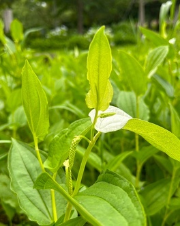 半夏生は6月下旬~7月初旬頃、白く細長い花穂が咲く時期に、葉の半分(表面)が白くなる不思議な植物です。