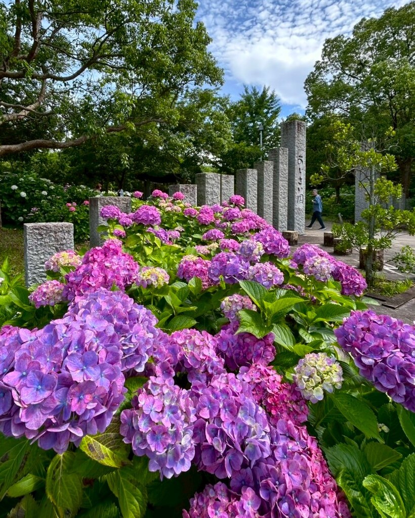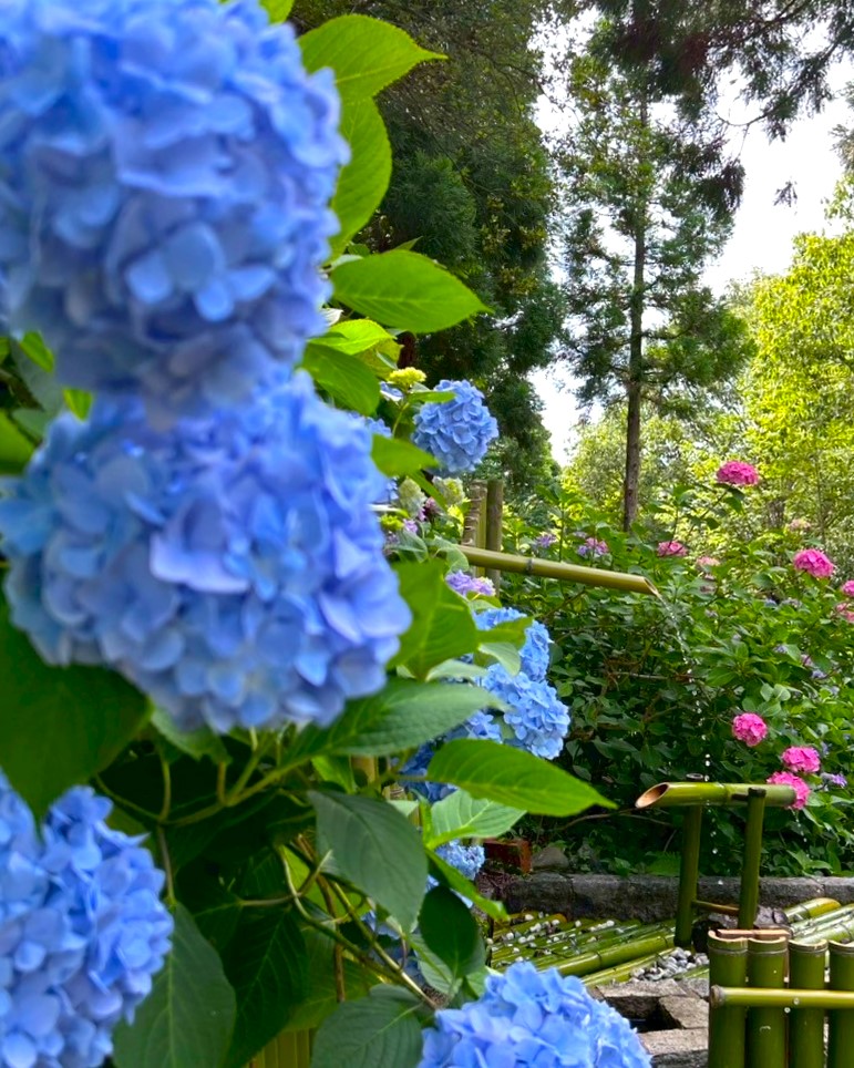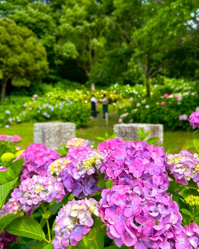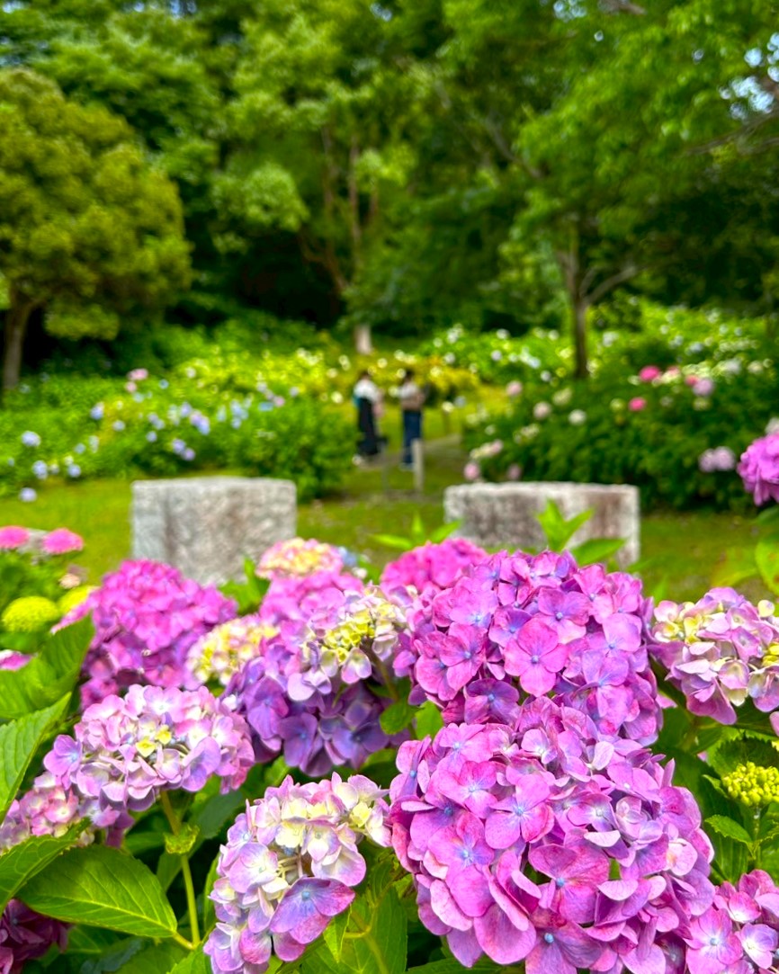 入口の大きな門を抜けると、そこは手毬のように可愛らしい色とりどりに咲くあじさいの世界