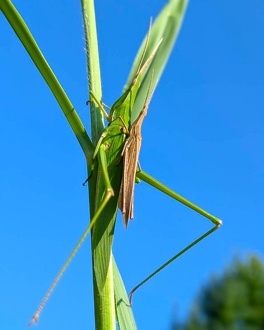 オスは飛ぶときに「キチキチキチ……」と音を出すことからキチキチバッタとも呼ばれ、後脚を揃えて持った際に身体を縦に振る動作をすることからコメツキバッタ(米搗蝗虫)もしくはハタオリバッタ(機織蝗虫)という別名もあります。