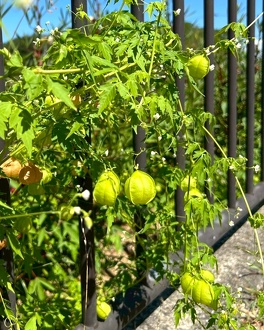 小さな白い花が咲きます。巻きひげでからみつきながらぐんぐんと育つので、夏のグリーンカーテンとしても使うことができます。別名は、バルーンバインというのですが、フウセンやバルーンと名がつくとおり、可愛らしい紙風船のような袋状の実をつけます。