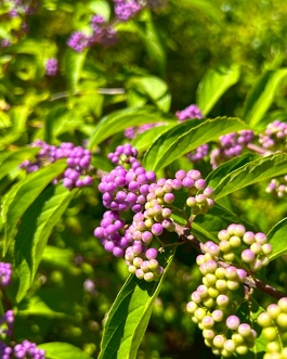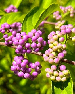 落葉低木で、湿り気の多いところを好み、紫色の実を群がるようにつけます。6月頃に淡い紫色の花を咲かせますが、何といっても晩秋まで残る美しい紫色の実の方が印象的です。だんだん色づき始め、大きく美しい紫の実をご覧いただけます。