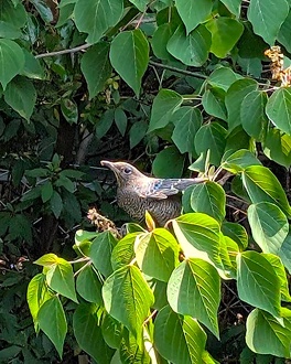オスは頭から腰あたりまで青灰色でお腹が赤褐色、メスは全体的に落ち着いた灰茶色で、羽がうろこ模様に見えます。ヒヨドリではなくツグミの仲間です。柔らかく澄んだ美しい声でさえずります。