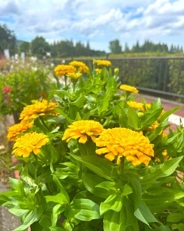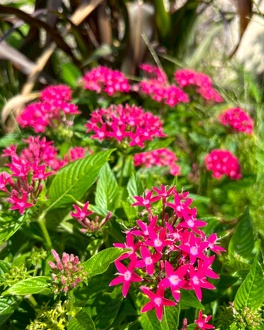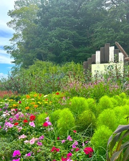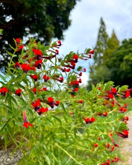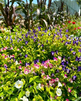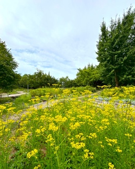 第2・第3駐車場から管理事務所へ向かう道中、交差点のすぐ側にある花壇です。たくさんの蝶が飛び交い、ジニアやセンニチコウ、バタフライピーやローゼル、ケイトウ、ビンカ、トレニア、ペンタス、ケイトウ、ローゼル、その他夏から秋への花々が暑さの中でも元気いっぱいです。
