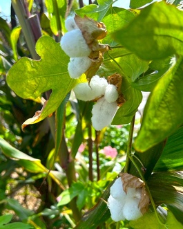 8月〜11月に実る果実はポップコーンのように膨れ、弾けた種子の毛は綿花として、紡績原料や布団の綿、脱脂綿の原料となります。綿の種子である棉実から採った綿実油は、食用油やマーガリン、石鹸の原料となります。綿実油を絞ったカス(粕)は飼料や肥料として使われます。すごい植物ですね!